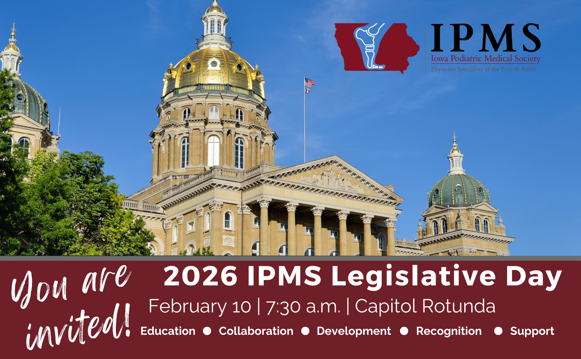 This is your annual opportunity to advocate for the podiatric profession and protect your livelihood. Join fellow IPMS members at the Iowa State Capitol to meet with legislators, share your expertise, and discuss issues that directly impact podiatric medicine and patient care in Iowa. Your voice matters, and your participation helps strengthen our profession and shape the future of podiatric medicine in the state.